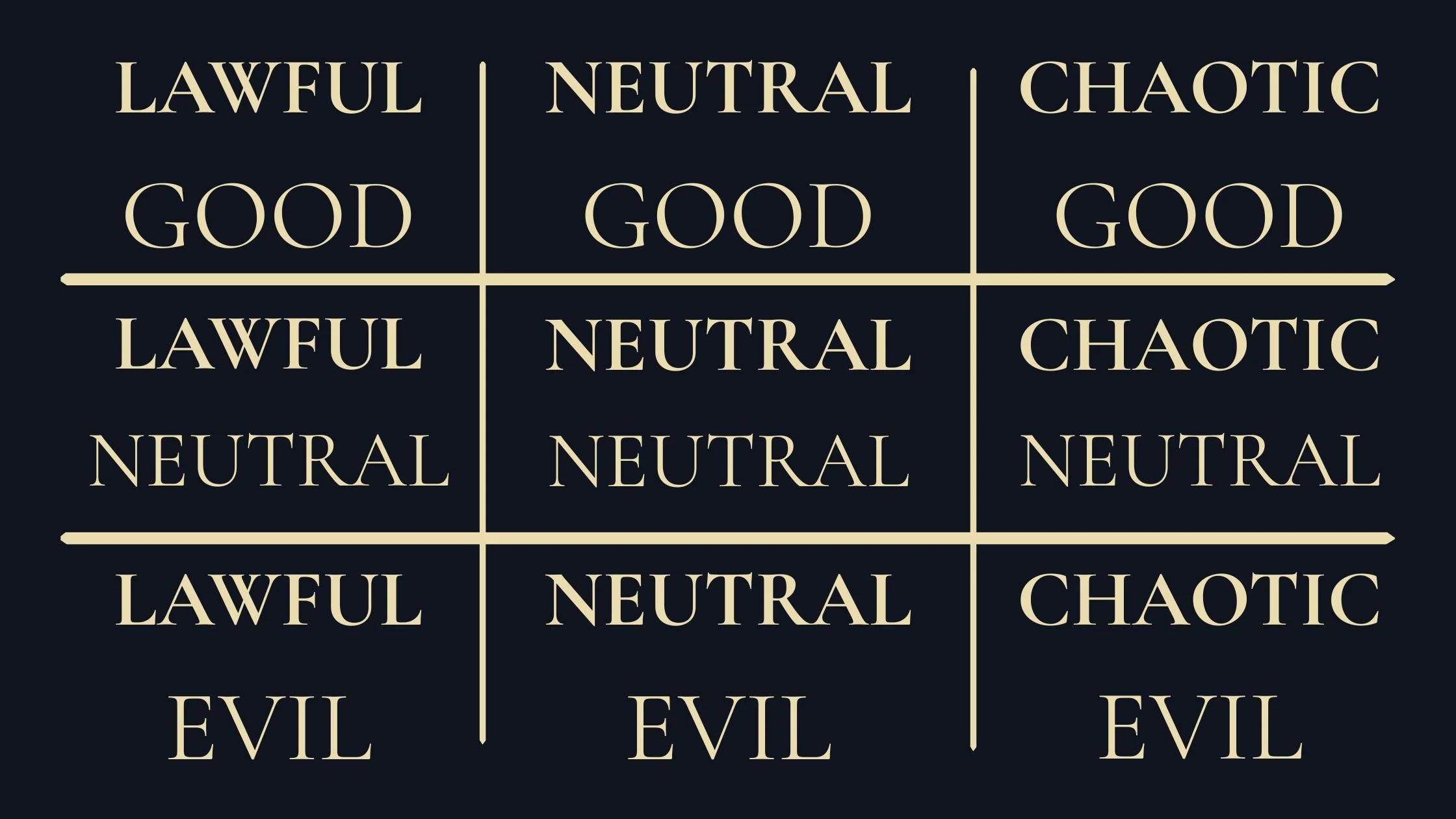 This question will be nothing new to anyone who has played Dungeons & Dragons. I’m actually rubbish at that game but this one part of it did interest me… the idea that a character wasn’t just good, neutral, or bad, but that they could be, within those classifications, lawful, neutral, or chaotic. (A neutral-neutral character would just be true neutral. Think apathy till the cows come home.)